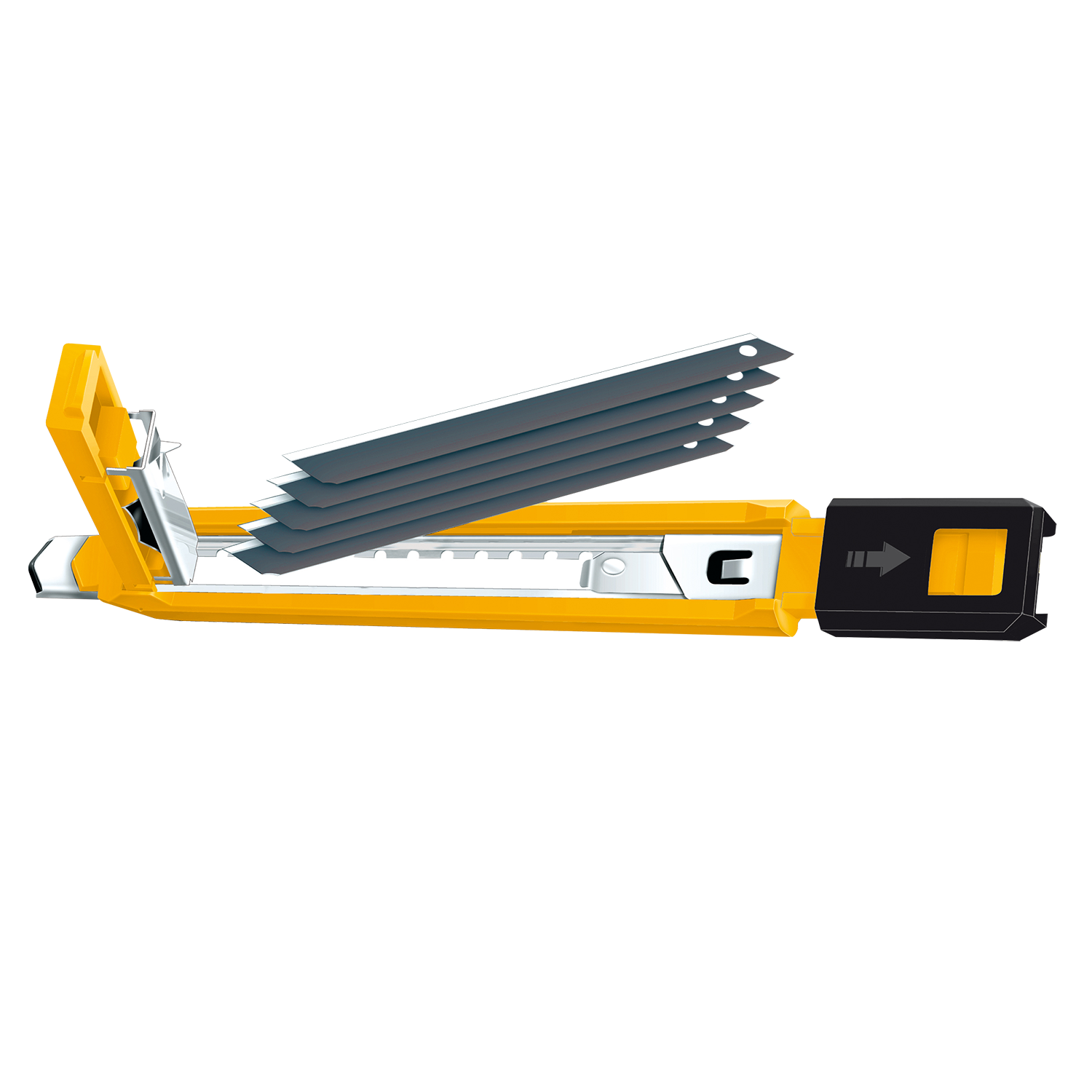 - Mit eingebauter Klingenhalterung, in der man bis zu 5 Klingen gleichzeitig lagern kann.